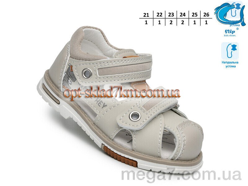 Цвет: серый; Материал изделия: искусственная кожа; Размерная сетка: 21-26; Материал подкладки: искусственная кожа; Материал подошвы: пвх; Страна: Китай; Размер (на фото): 21; Сезон: лето; Пол: дети; Тип: мальчик; Материал стельки: натуральная кожа;