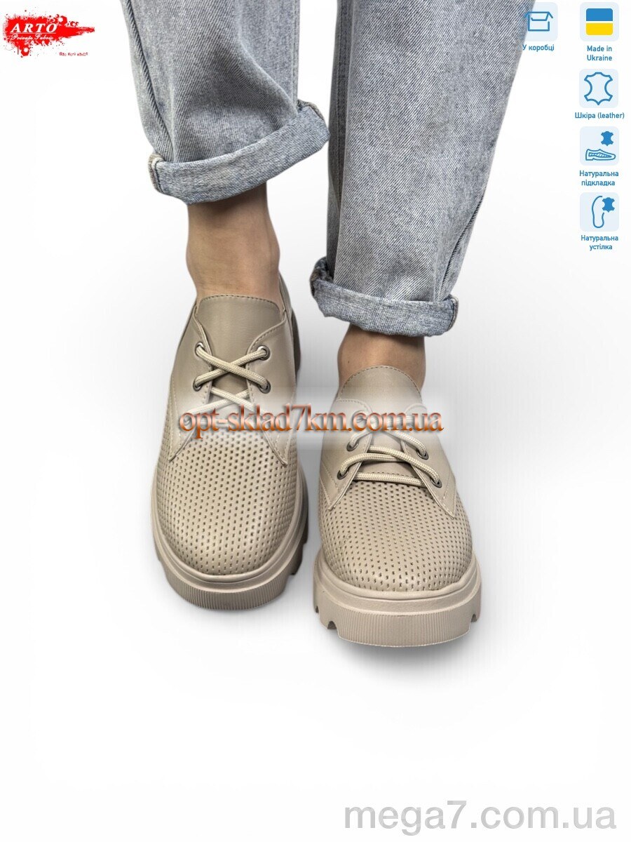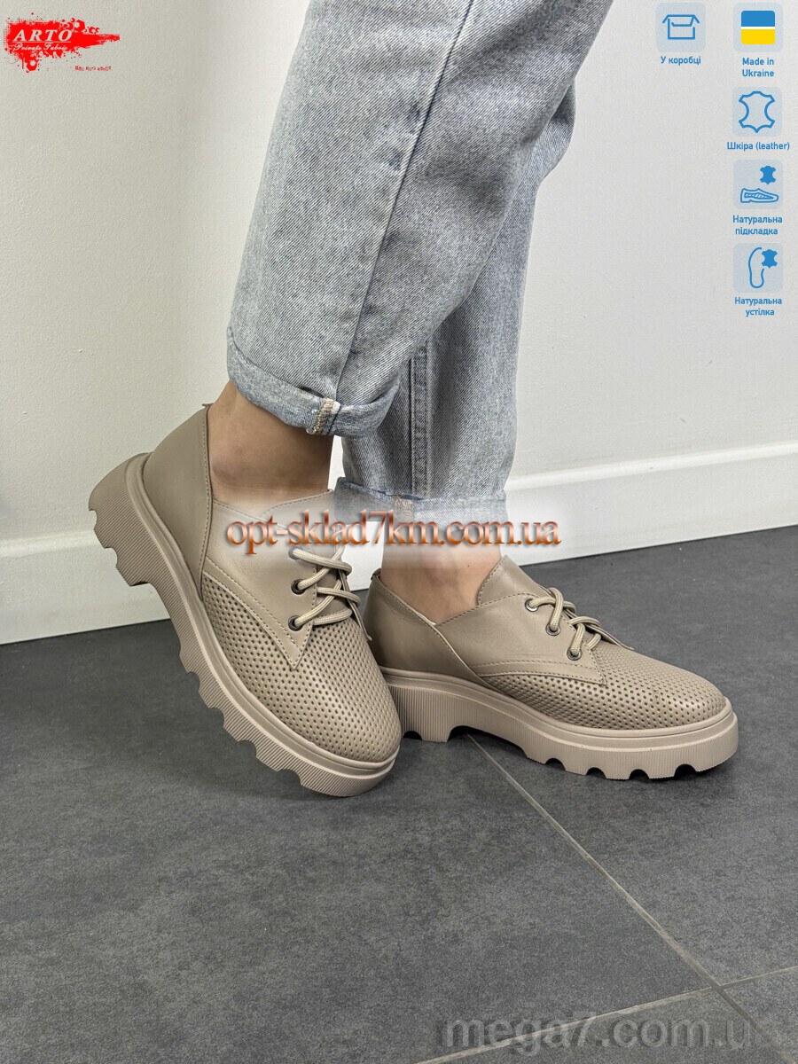 Цвет: бежевый; Материал изделия: натуральная кожа; Размерная сетка: 36-40; Материал подкладки: натуральная кожа; Материал подошвы: пена; Страна: Украина; Высота каблука, см: 3.5; Высота платформы: 2; Размер (на фото): 38; Сезон: лето; Пол: женщины; Материал стельки: натуральная кожа; Коробка: да; Фото поставщика: да;